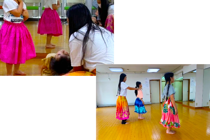 ハワイの音楽に合わせて、みんなで楽しくフラを踊るレッスンです。